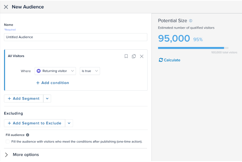 You can backfill an audience from historical data once with visitors who meet the audience conditions. This applies to both new and existing audiences. Potential Size shows the estimated number of qualified visitors in existing data: