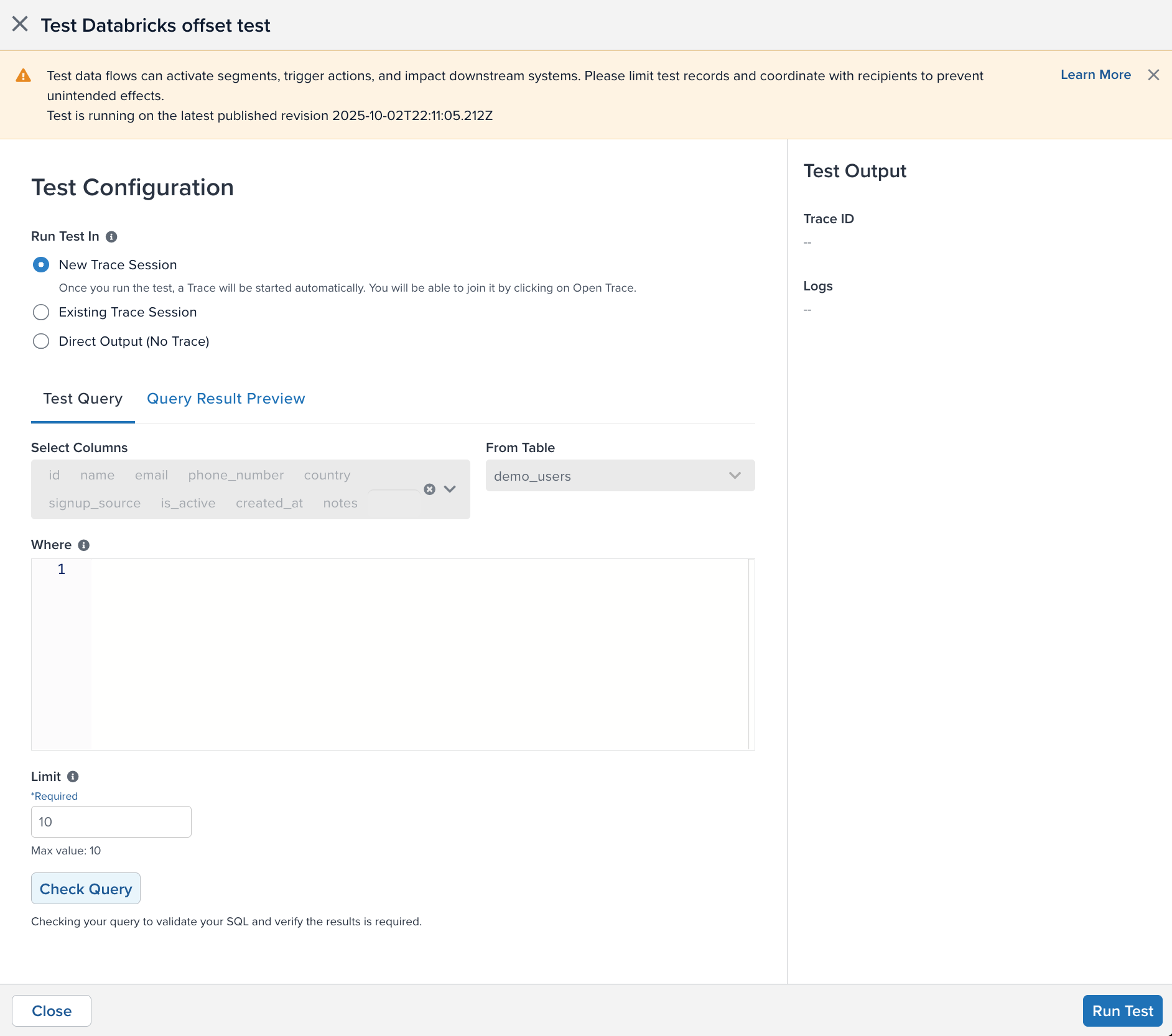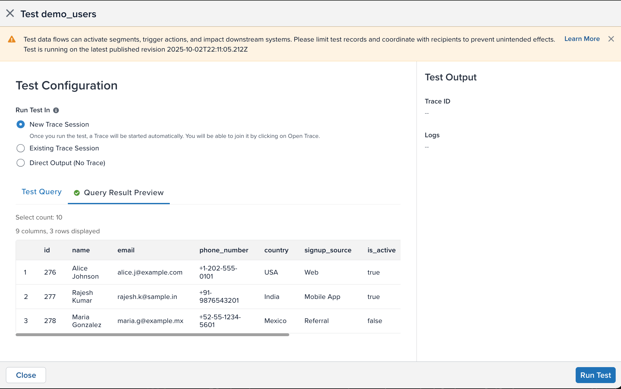 We recommend that you test the data source and query before enabling data sources, segments, or activations. However, running a test may activate segments, trigger enabled actions, or affect downstream systems. To prevent unintended results, disable connectors and functions, limit test records, and coordinate with recipients.