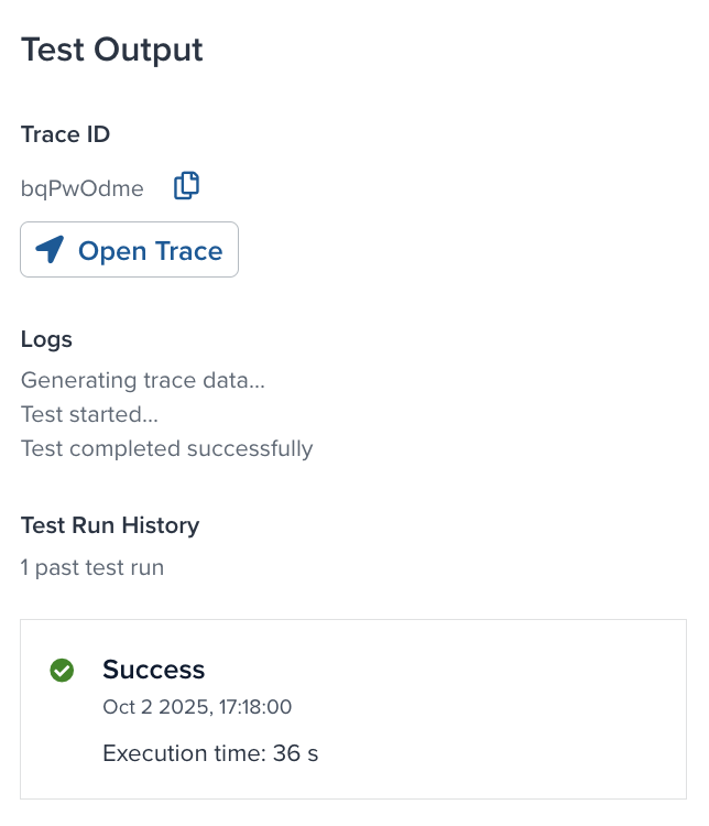 - New Trace Session: The output will be displayed in a new trace session with up to 10 records. This option is best for confirming end-to-end verification and log details.