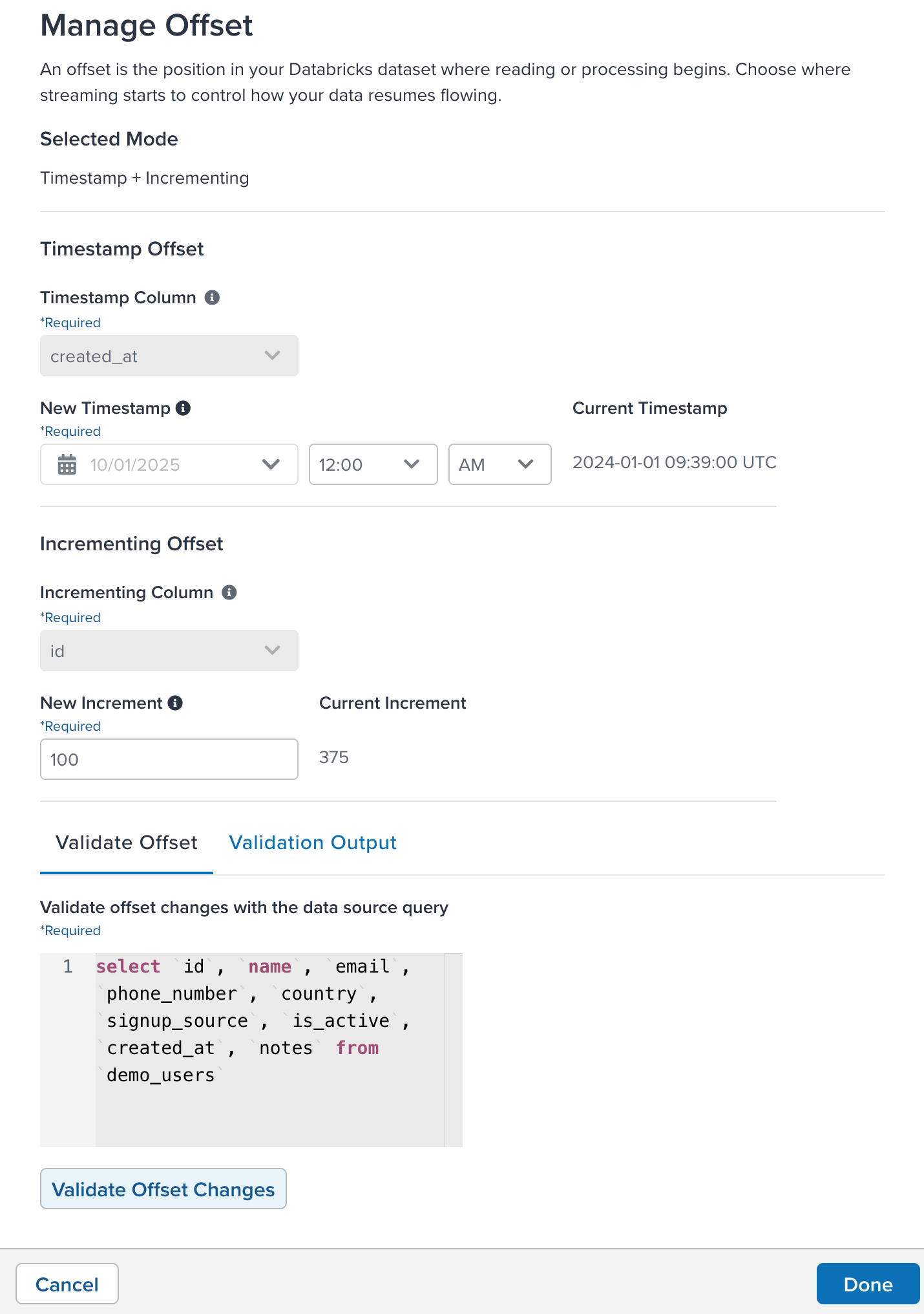 - The query mode is Timestamp + Incrementing (Recommended), Timestamp, or Incrementing. You cannot manage the offset for Full Resync query mode.