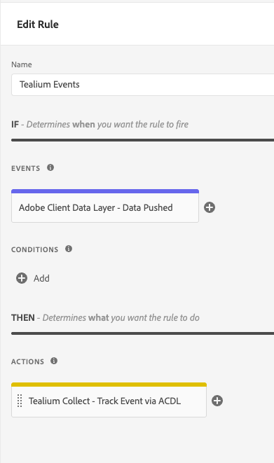 The extension provides two action types for sending data to Tealium Collect. Each can be added to a rule in Adobe Launch depending on your site’s data-layer strategy.