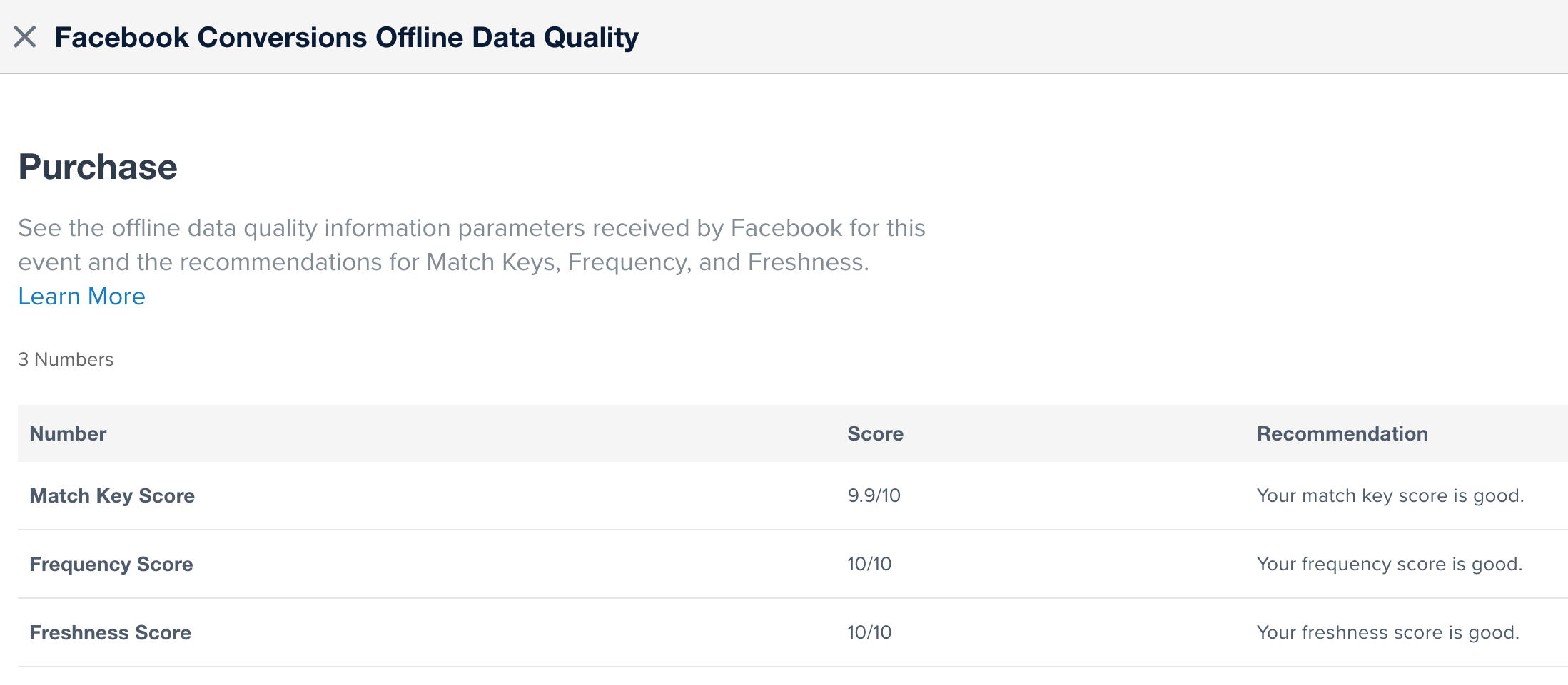 - Freshness Score: A score from 1 to 10 indicating how current your data is over the last 28 days. Meta recommends sending offline events within 3 days from when they occur.
