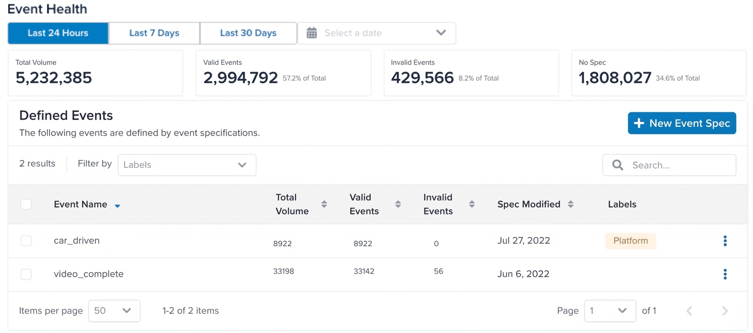 Event specifications (also referred to as “event specs”) represent your data layer for events. Event specifications allow the data quality of your events to be validated in real-time using the live events chart or event specification detail view.